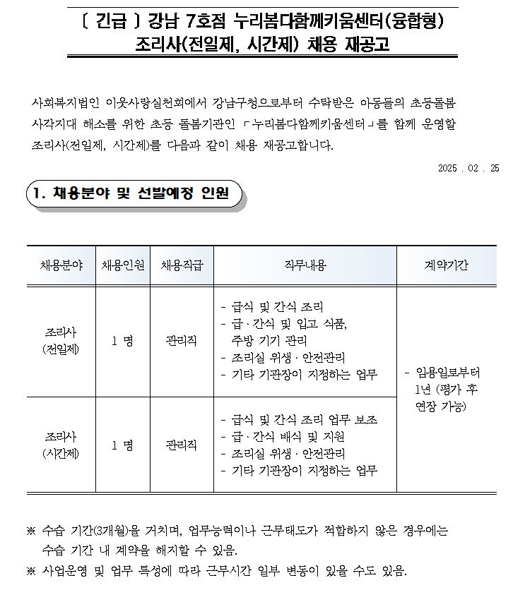 (긴급) 강남7호점 누리봄다함께키움센터(융합형) 조리사(전일제, 시간제) 채용 재공고