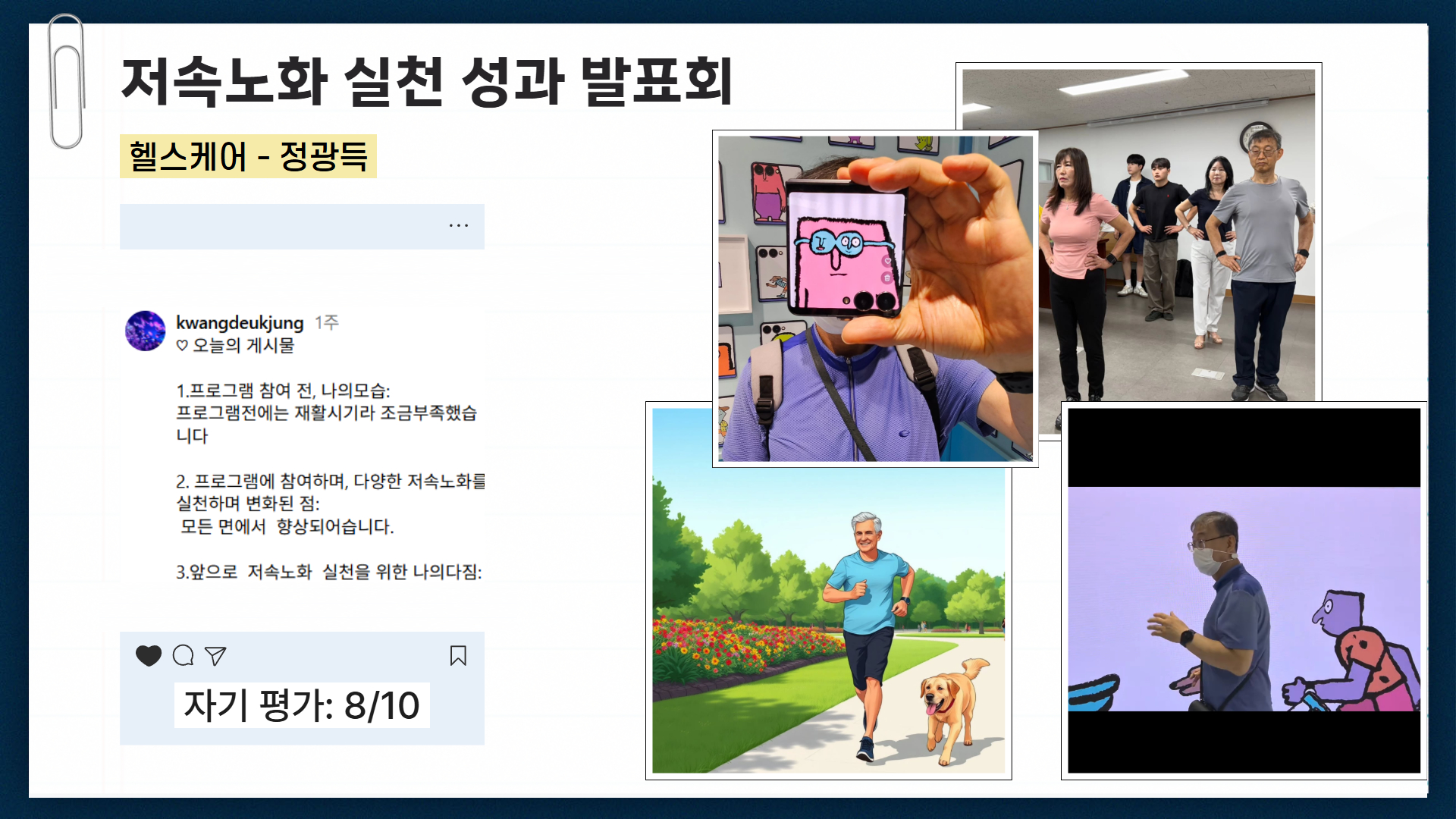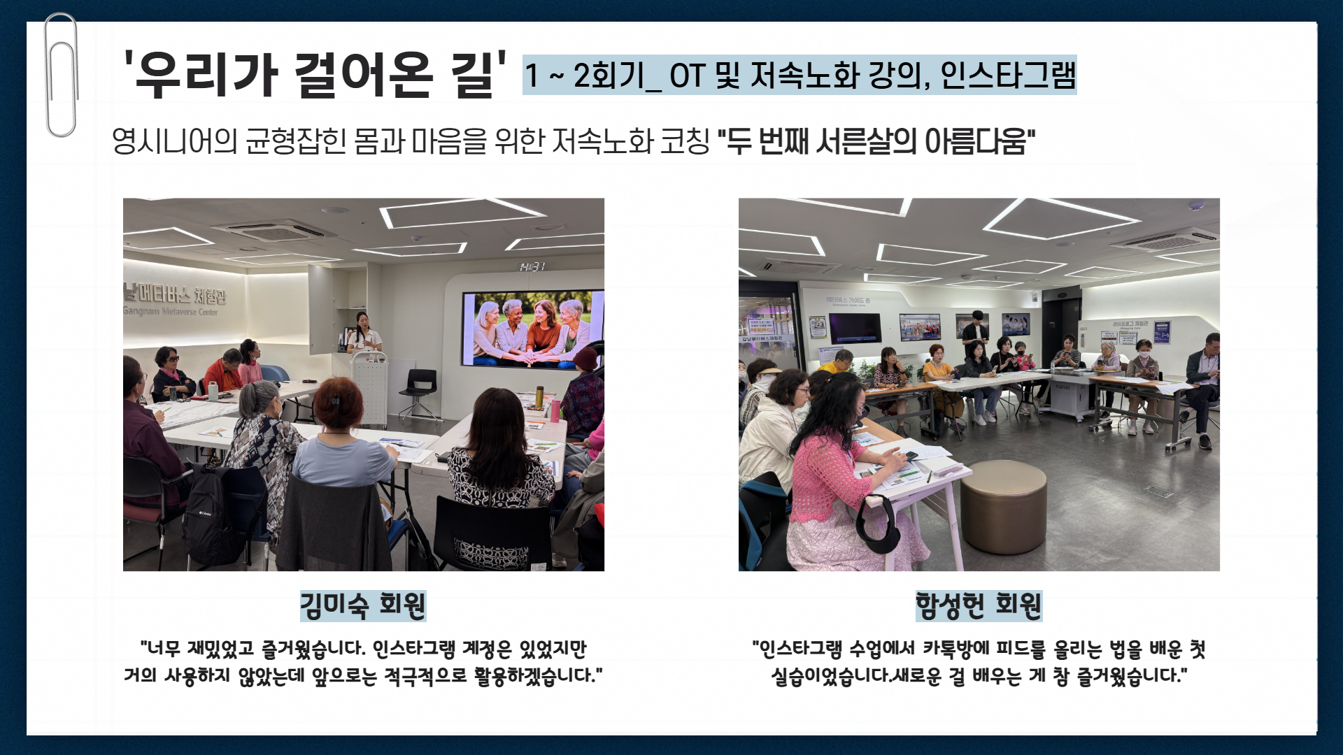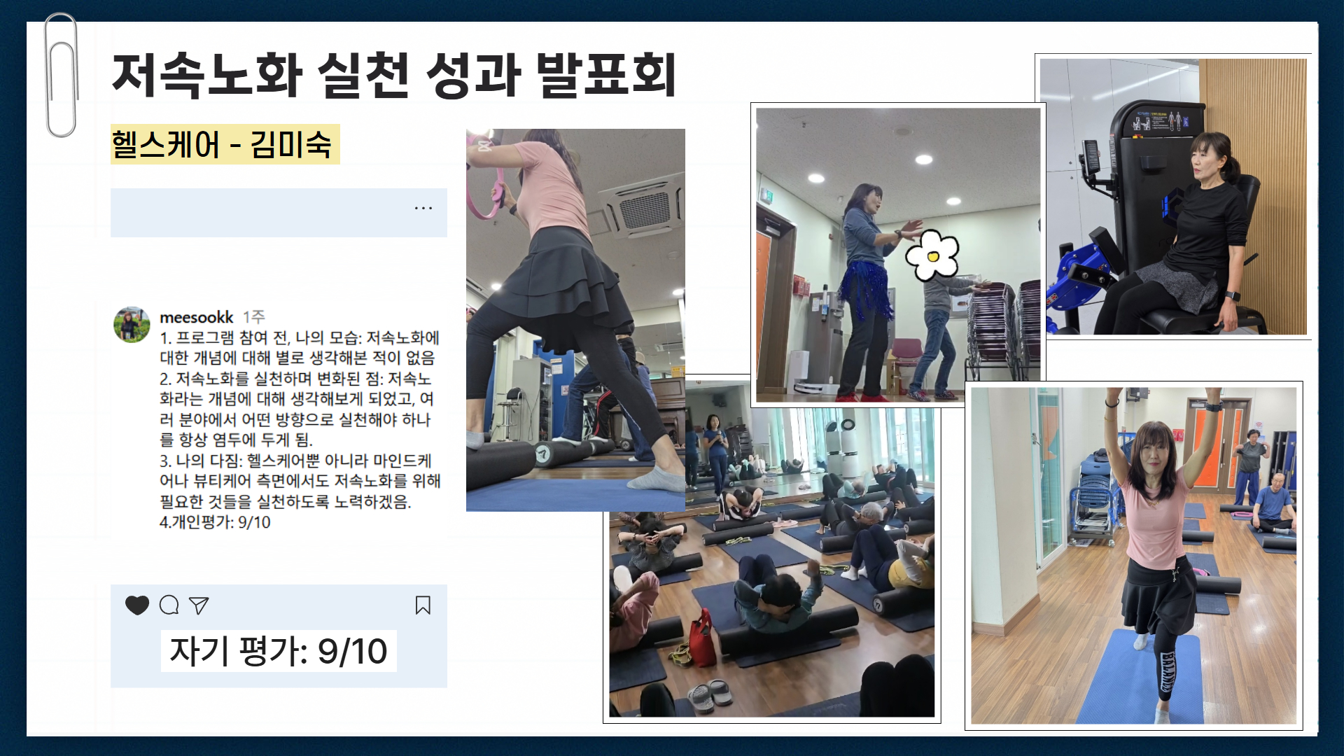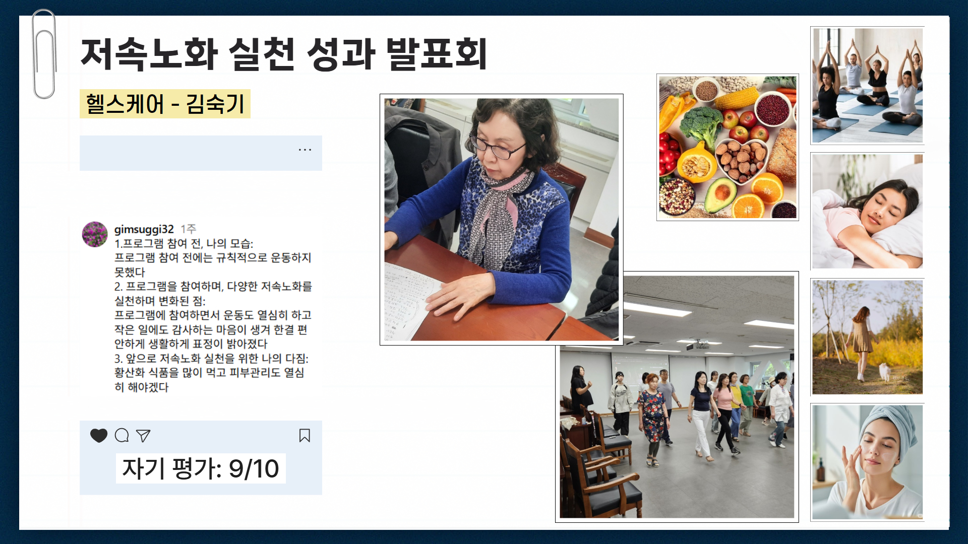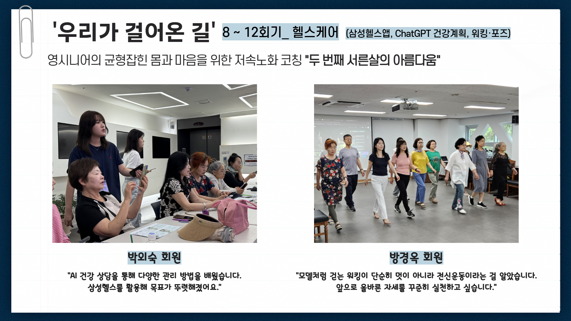 활동을 마무리하며 참여 회원들은 “앞으로 남은 인생 여정에서 저속노화를 실천하며 건강하고 스마트한 영시니어로 살아가고 싶습니다.”,