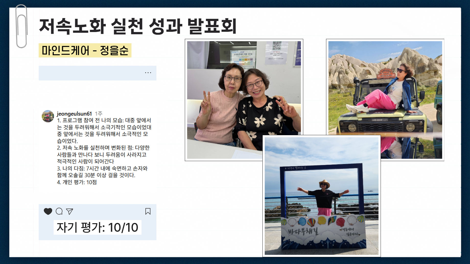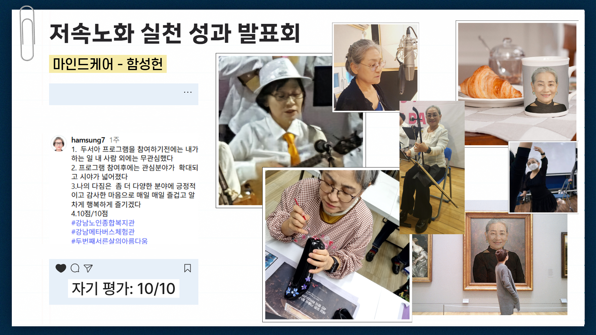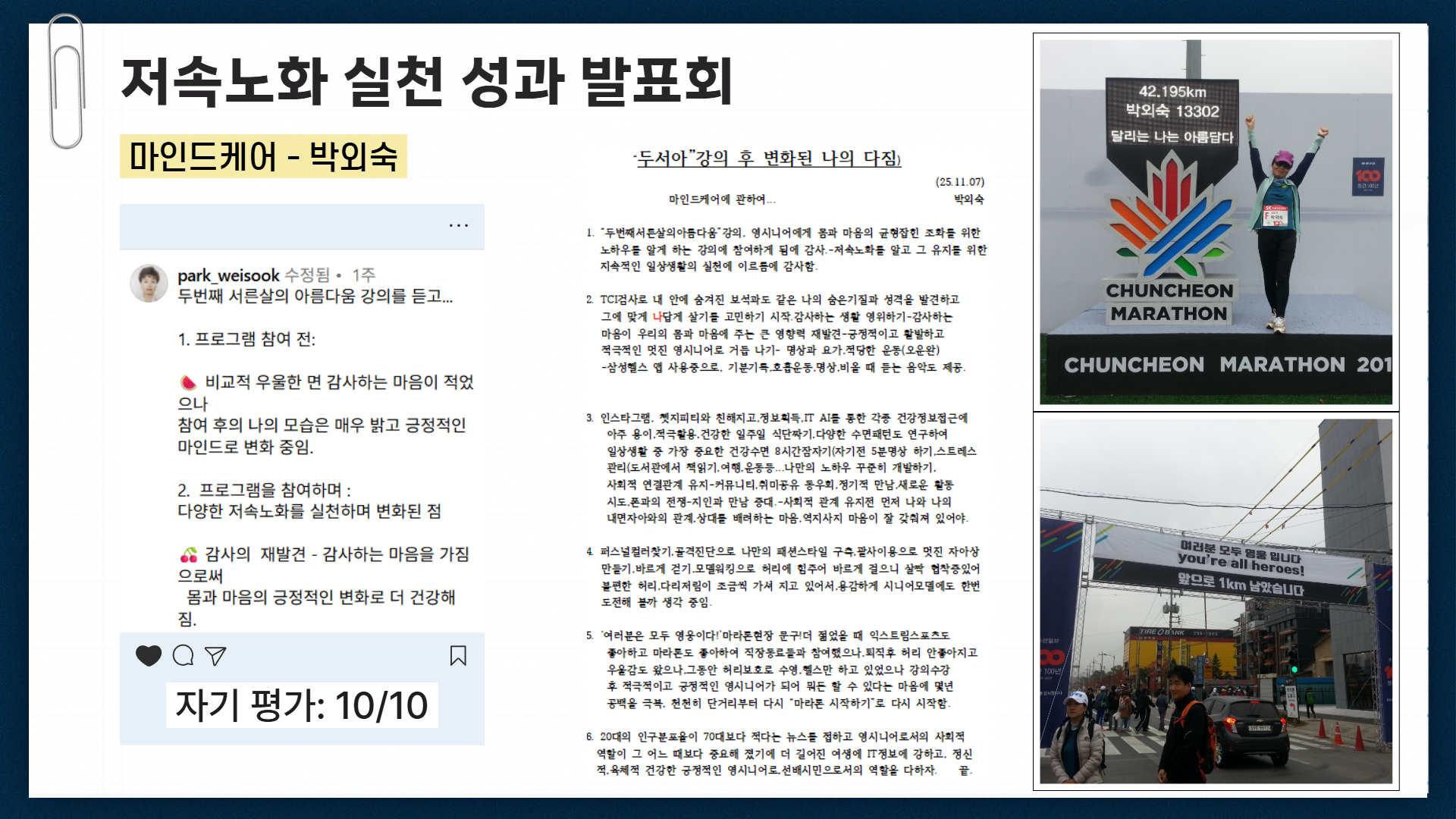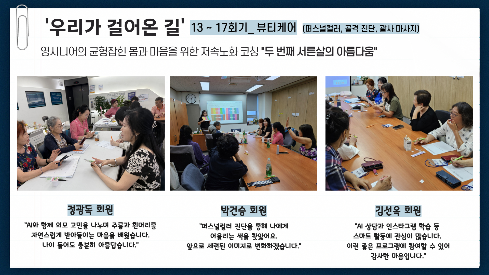 활동을 마무리하며 참여 회원들은 “앞으로 남은 인생 여정에서 저속노화를 실천하며 건강하고 스마트한 영시니어로 살아가고 싶습니다.”,