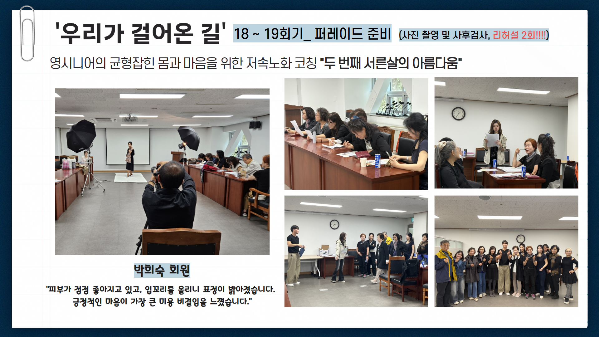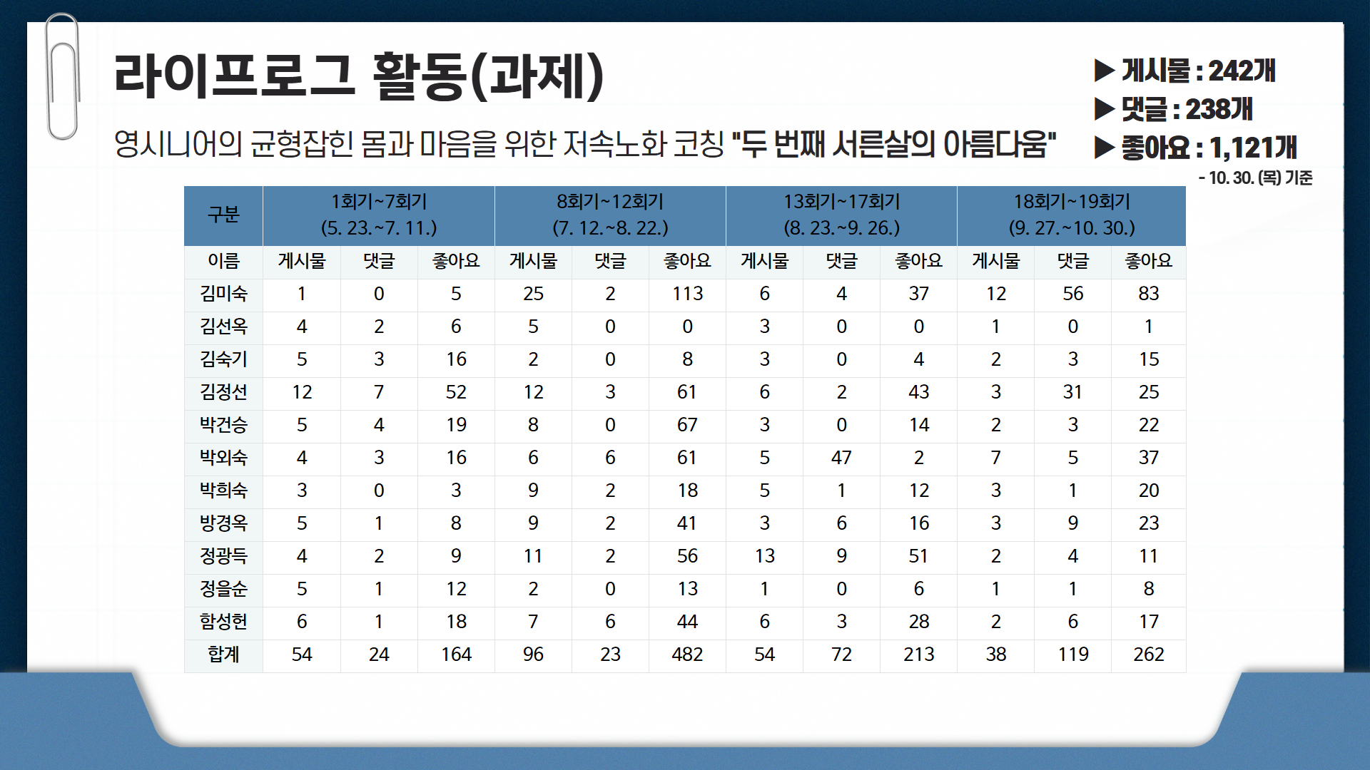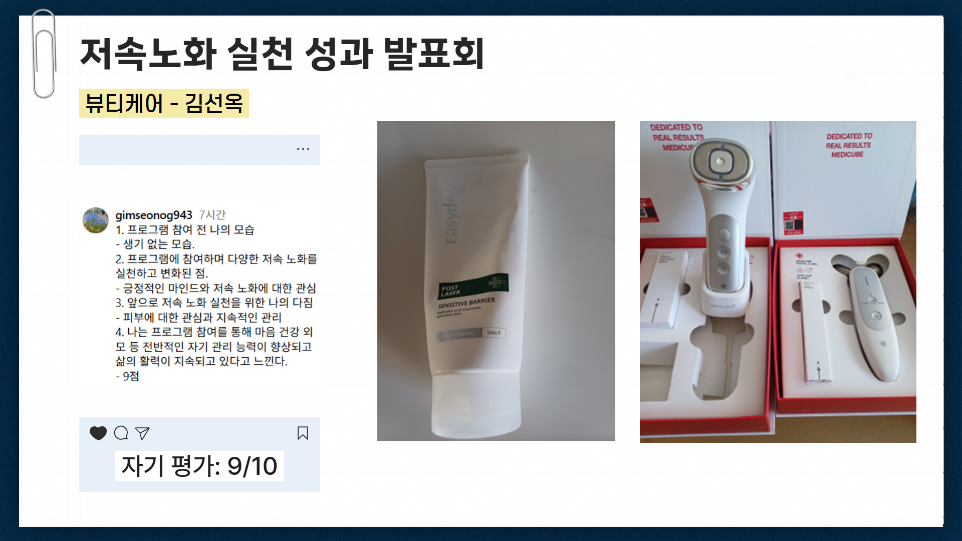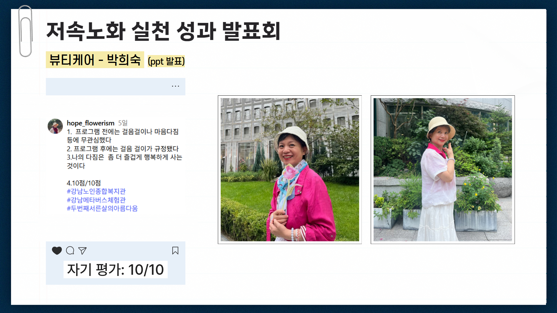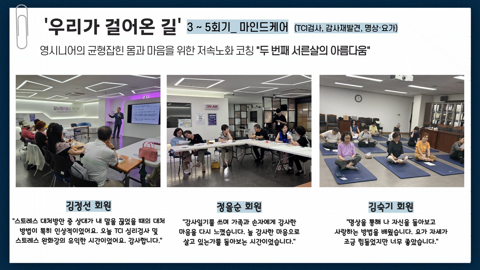 활동을 마무리하며 참여 회원들은 “앞으로 남은 인생 여정에서 저속노화를 실천하며 건강하고 스마트한 영시니어로 살아가고 싶습니다.”,