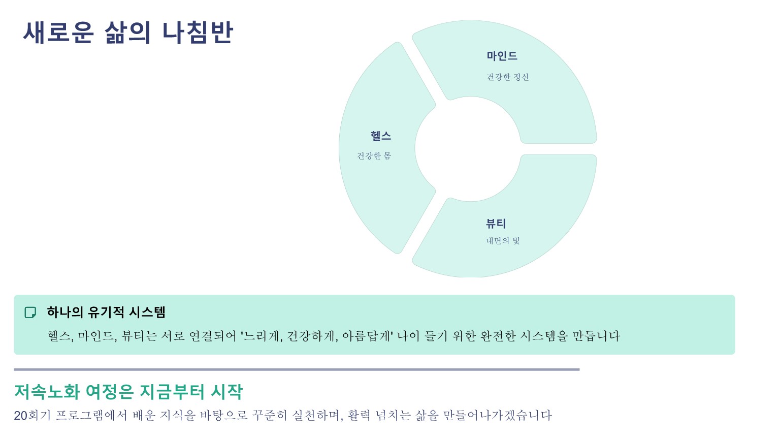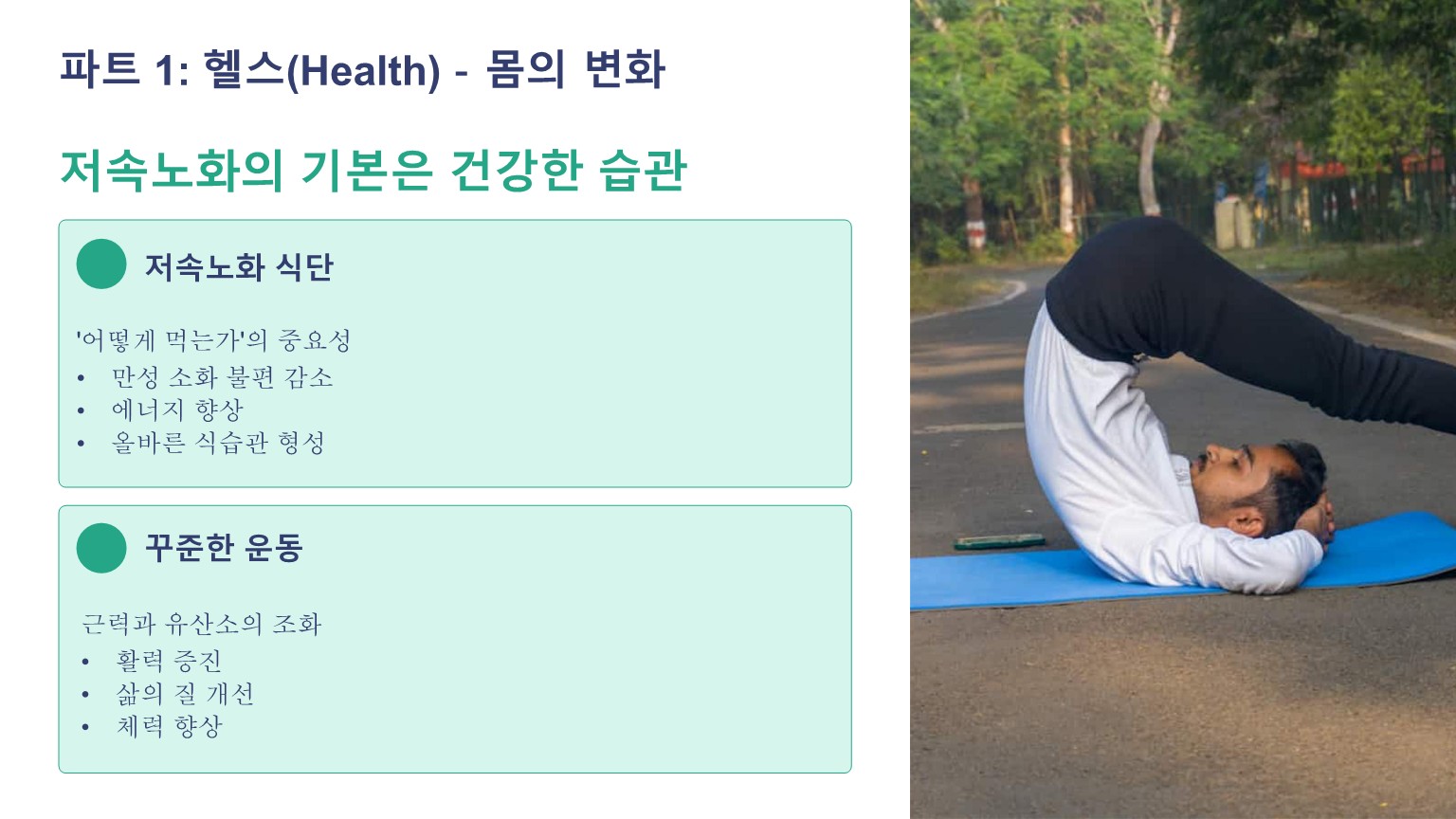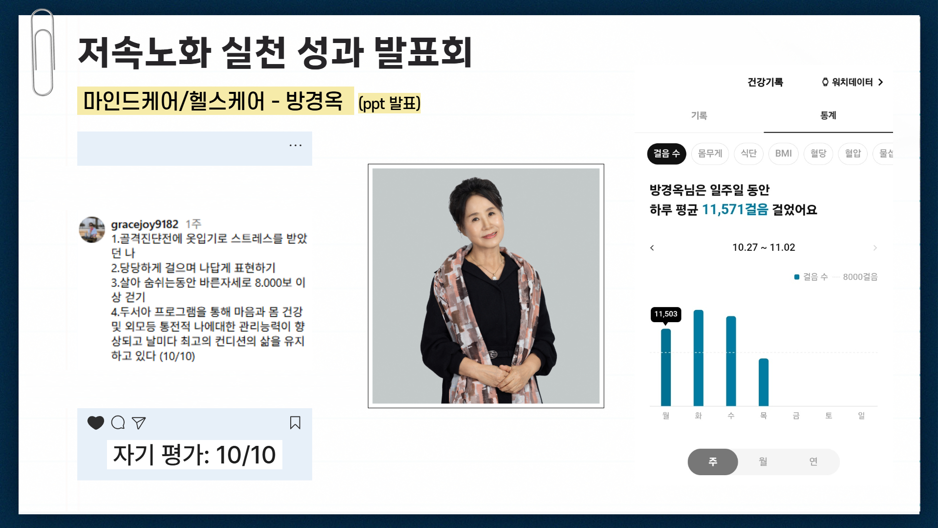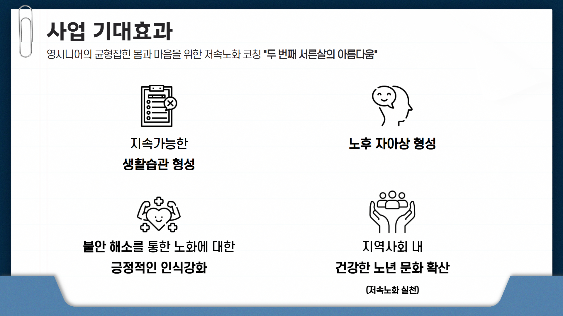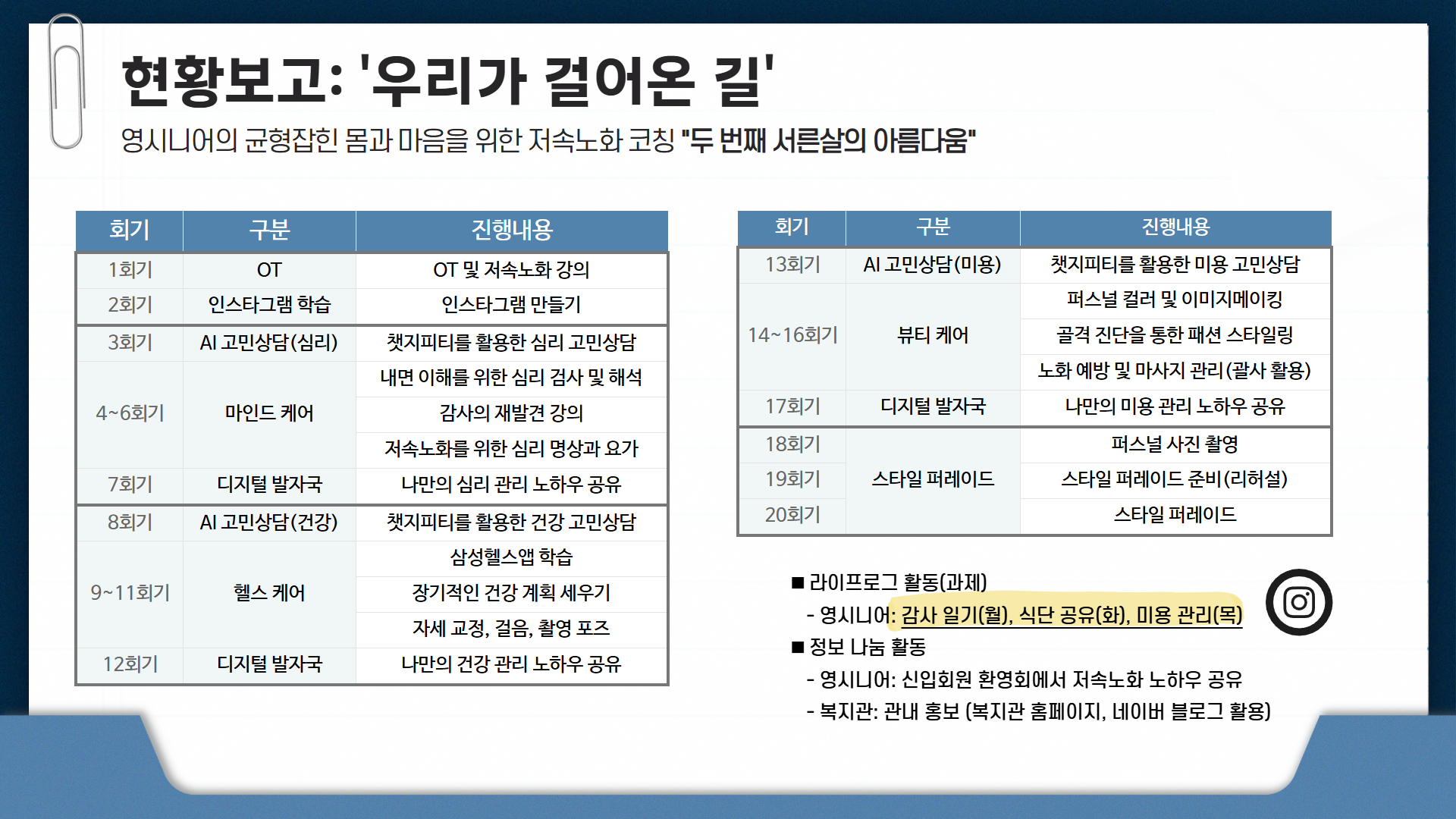 활동을 마무리하며 참여 회원들은 “앞으로 남은 인생 여정에서 저속노화를 실천하며 건강하고 스마트한 영시니어로 살아가고 싶습니다.”,