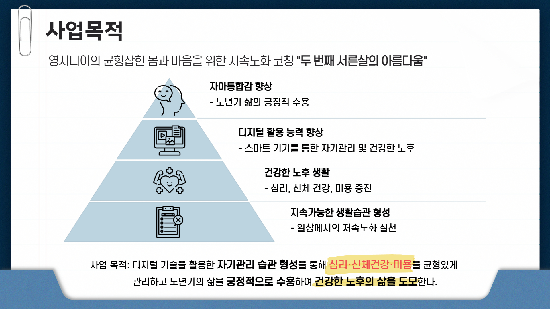 이번 프로그램을 통해 참여 회원들의 높은 만족도를 확인하며, 건강한 자기관리 문화 확산과 디지털에이징을 접목한 프로그램의 첫걸음을 내디뎠습니다.