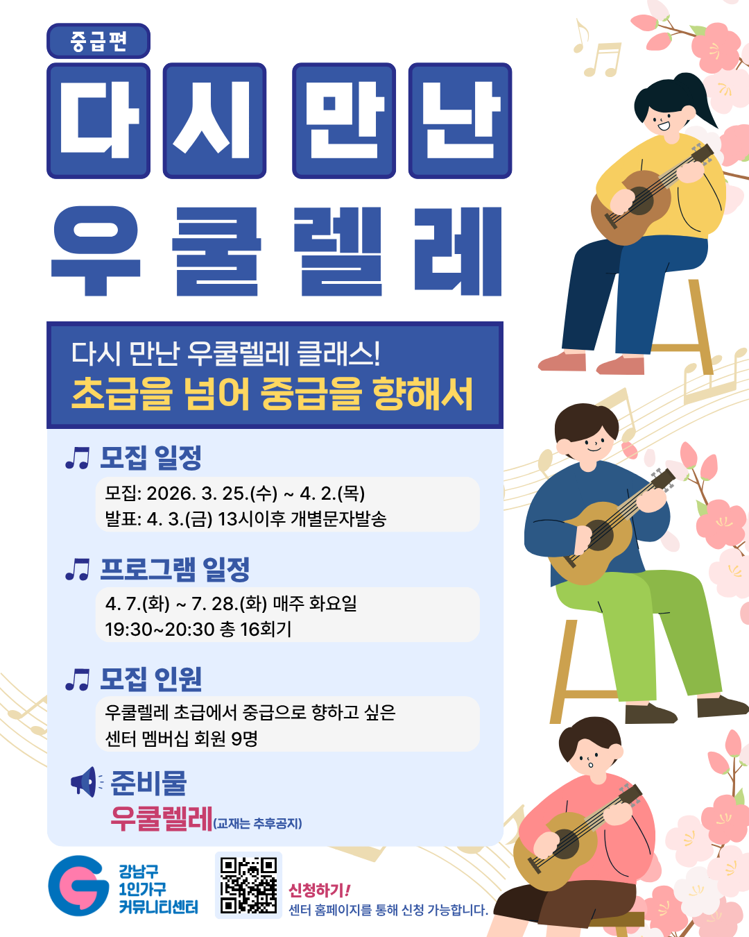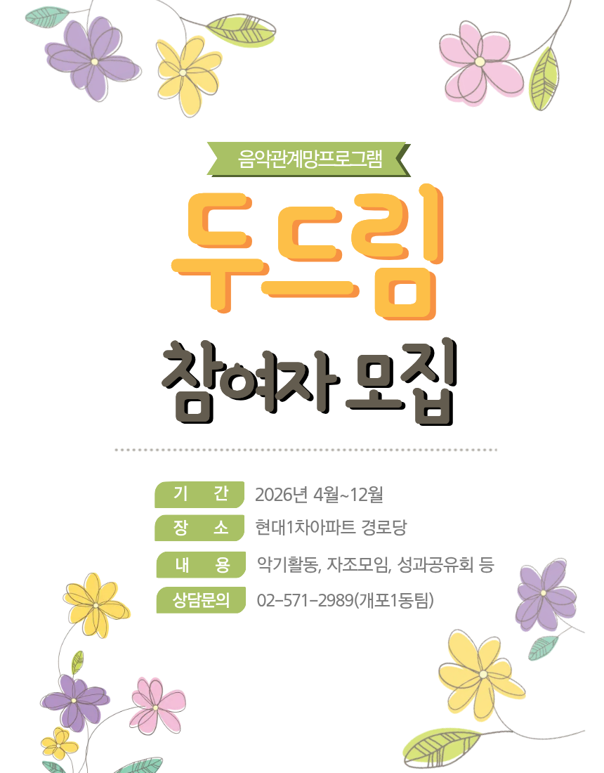 실생활에 필요한 정보를 욕구별로 찾아보세요. 복지소식 복지소식 더 보기 [강남구1인가구 커뮤니티센터] 다시 만난 우쿨렐레_중급편 [강남종합사회복지관] [강남종합사회복지관] 채움플러스(악기강좌) 수강생 모집 [능인종합사회복지관] 두드림 참여 어르신 모집 [태화기독교사회복지관] [태화기독교사회복지관] 2026년 아동심리정서지원사업 마음ON 「도란도란」 참가자 모...